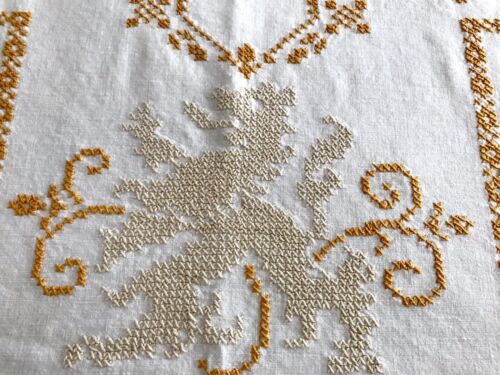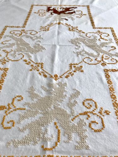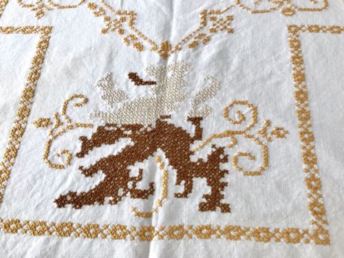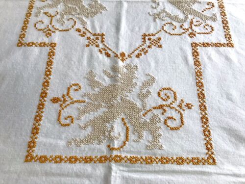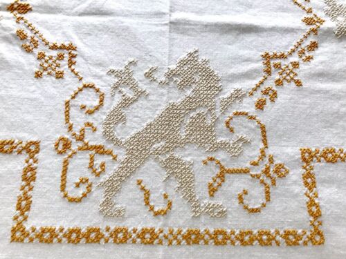 Antik Tischdecke schöne Stickerei Löwe? Drache? handbestickt Siebenbürgen ?