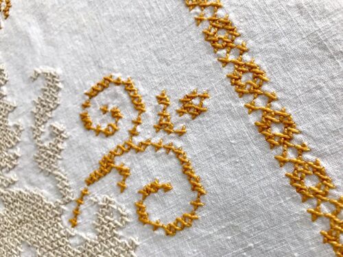 Die Stickerei ist in Flachstickerei-Technik und zwar in Kreuzstich gearbeitet.