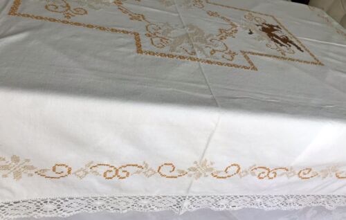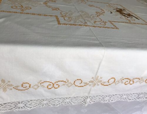 Kommodengriff präsentiert eine wunderschöne antike rechteckige mit wundervoller beeindruckenden Stickerei handbestickte weiße Tischdecke aus Baumwolle mit wunderschöner Stickerei gearbeitet