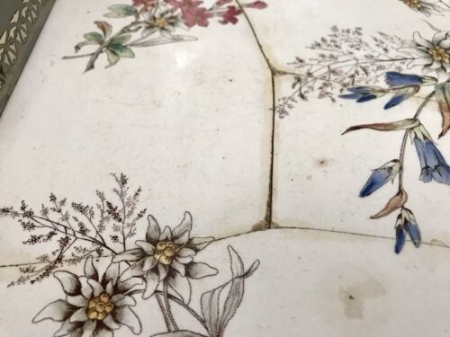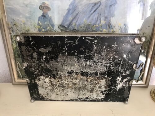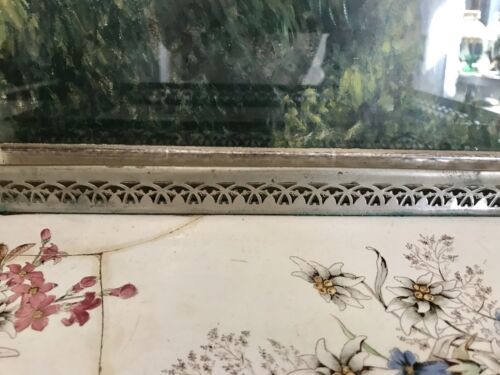 Antik um 1870 Tablett Metall Porzellan florales Muster Galerierand Kugelfüsschen
