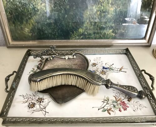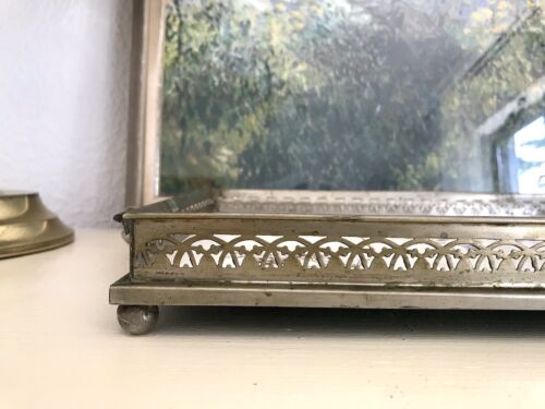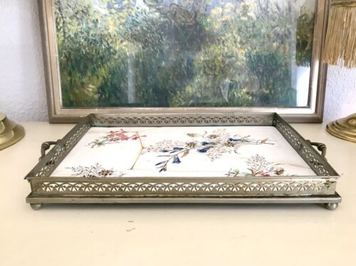 Kommodengriff präsentiert ein wunderschönes antikes rechteckiges Tablett mit Porzellaneinsatz und Metallmontur mit Galerierand