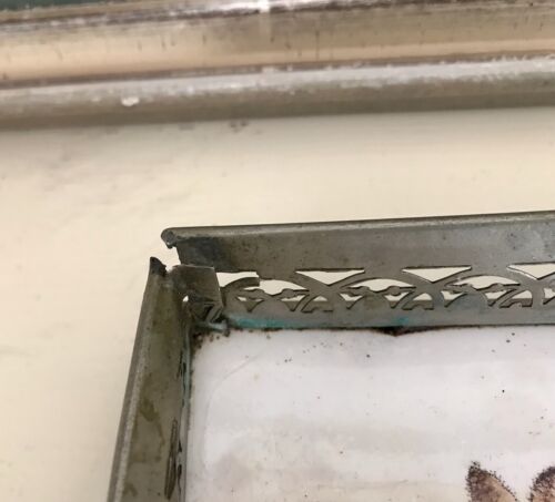 Metallmontur mit Patina und an 2 oberen Ecken leicht gelöst, aber dennoch stabil.