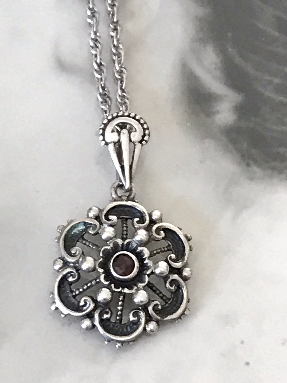 Sehr schönes Design mit rundem mittelgroßem in schönem Durchbruchmuster gearbeiteten Anhänger mit angedeuteten Voluten Granulierungen und zentralem rubinroten Stein.