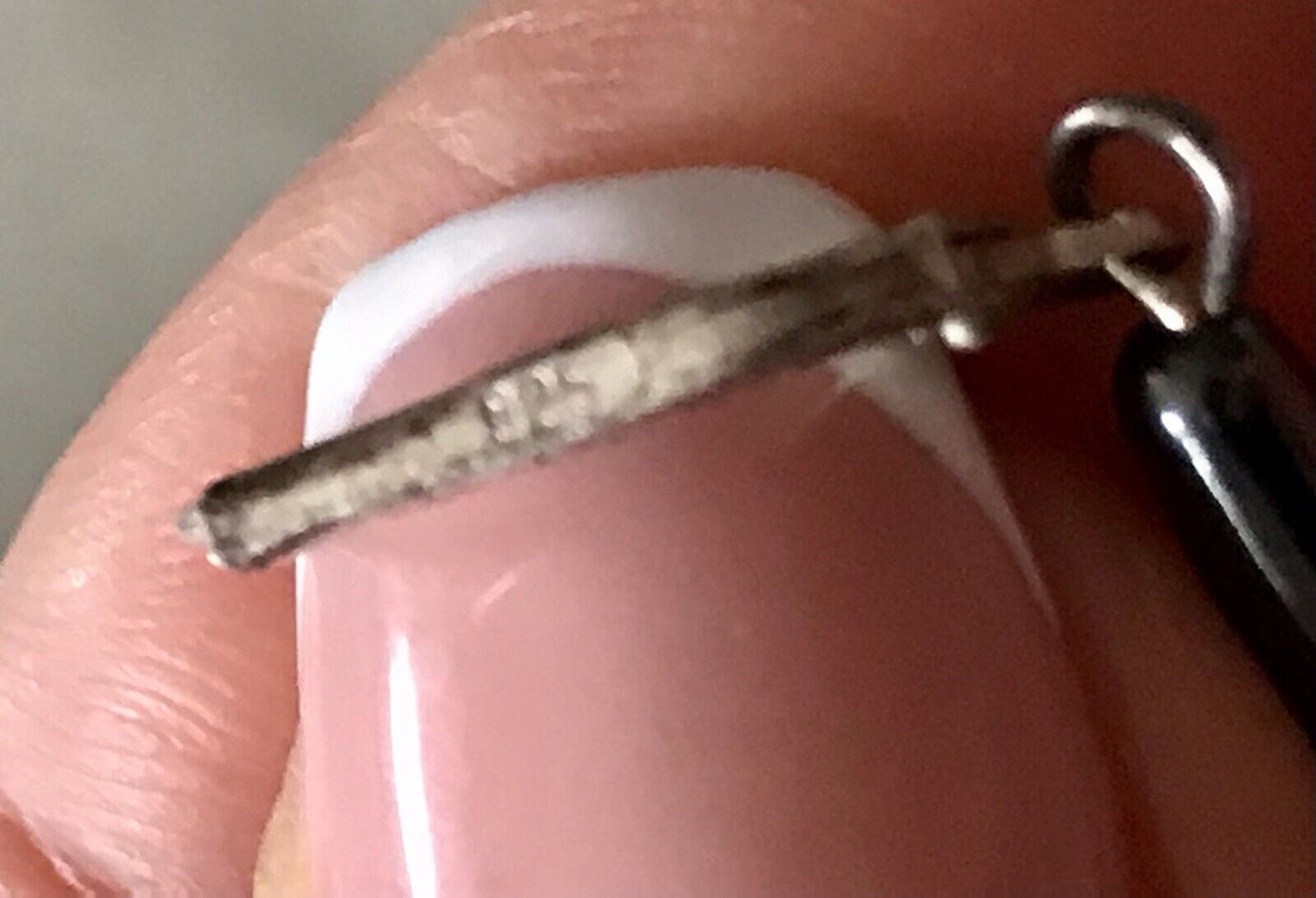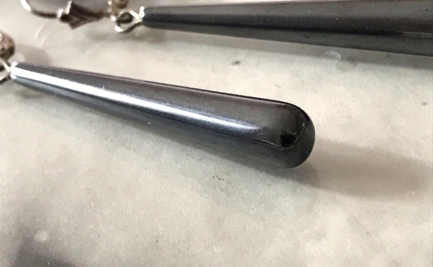 Sehr schönes elegantes wundervolles Design mit baumelndem langen unten etwas breiterem als oben Pampel aus Hämatit.