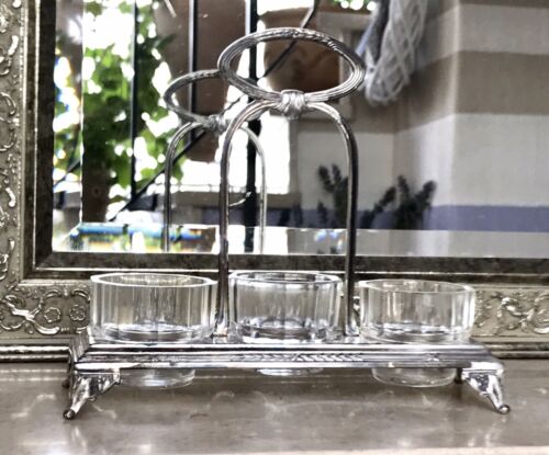 E02-24Kommodengriff präsentiert eine seltene antike mit WMF Straußenmarke gepunzte Jugendstil-Menage Gewürzständer mit Glaseinsätzen