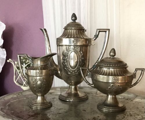 Kommodengriff präsentiert ein wunderschönes antikes außergewöhnlich schönes und seltenes 3teiliges versilbertes WMF WMFN Kaffe- oder Tee-Kernstück