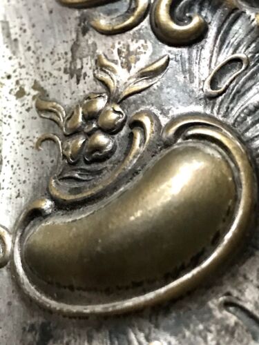 Wundervolles Tablett ist versilbert gewesen, leider am Rand insbesondere an den hervortrettenden Elementen/Wölbungen berieben und dort messingfarben.