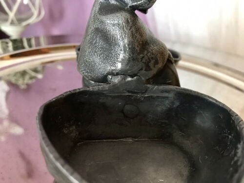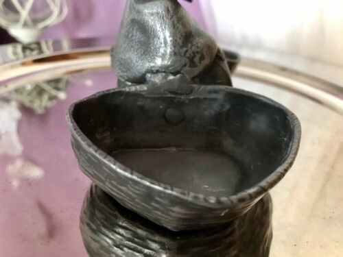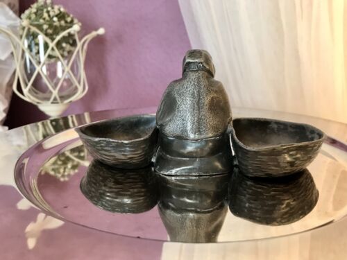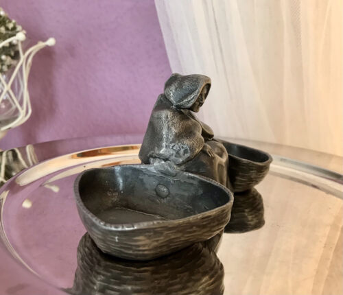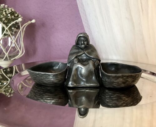 Kommodengriff präsentiert 1 antike wundervolle Saliere Doppelfässchen für Gewürze Salznapf aus Zinn in Form einer sitzenden Greisin mit 2 Körben