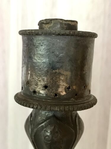 Runde zylindrische breitere Tülle mit kleinen sternförmigen Öffnungen rundum, vermutlich hatte der Leuchter einen Glasschirm gehabt.
