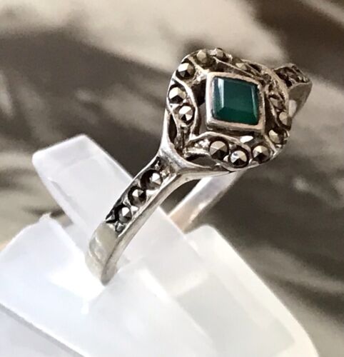 Kommodengriff präsentiert einen wunderschönen edlen zauberhaften antikisierten in Art Déco gearbeiteten Silberring Damenring in Gr.57/58/18,4 laut Ringstock Durchmesser innen mit grünem Stein und Markasiten besetzt