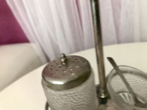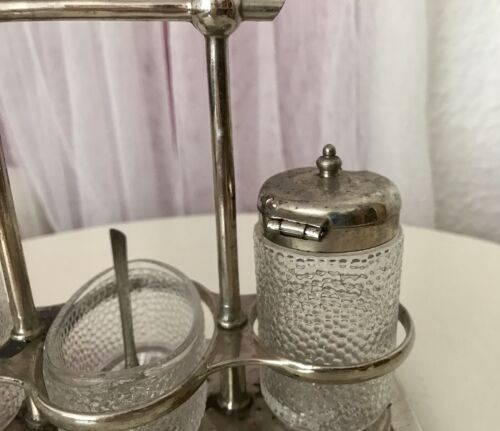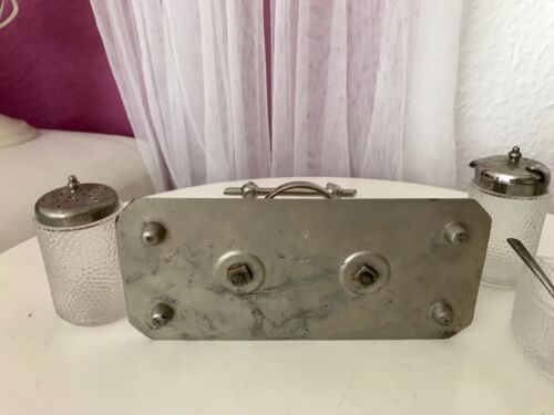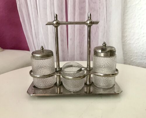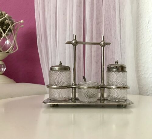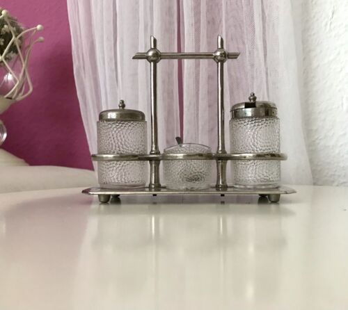 Kommodengriff präsentiert eine schöne antike Art Déco Menage Gewürzständer mit schönen Glaseinsätzen aus Pressglas und 1 Löffelchen
