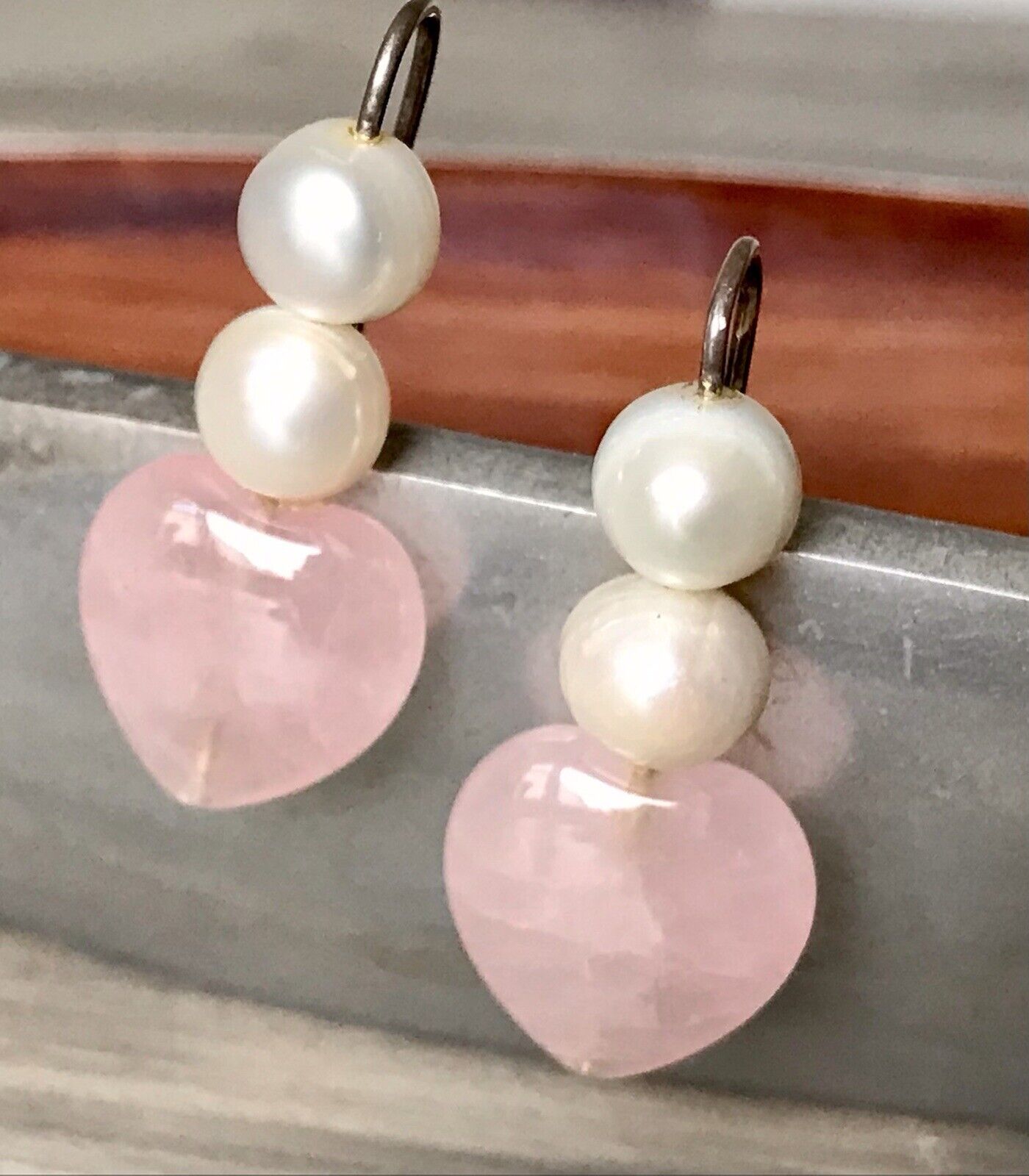 Wunderschöne originelle süße Ausformung mit untereinander angeordneten straff sitzenden Elementen, mit zentralem Rosenquarz-Herzen, darüber 2 Zuchtperlen per Tunnel am anderen Ende des Hakens befestigt.