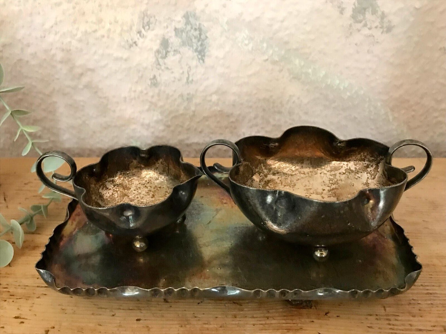 hübsches stilechtes Set Antik Art Déco Sahnesatz Milch Zucker Tablett versilbert
