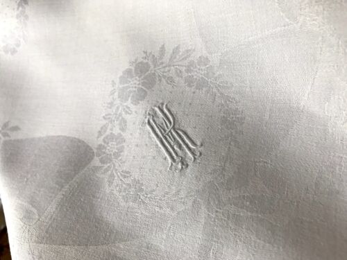 Kommodengriff präsentiert eine (von 2 verfügbaren)wunderschöne antike große weiße edle rechteckige Jugendstil-Leinen-Serviette Stoffserviette aus Leinen Leinendamast mit handbesticktem Monogramm und wundervollem floralen Muster als umlaufende Girlanden-Bordüre und einzelne runde Kränze/Medaillons- Elemente