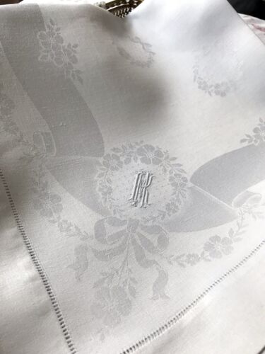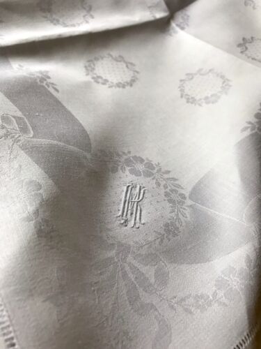 Aus feinem Leinen/sogenanntem edlen Seidendamast mit wunderschönem und floral stilisiertem Muster als umlaufende florale Girlanden/Behänge-Bordüre und geschweiftes Band.