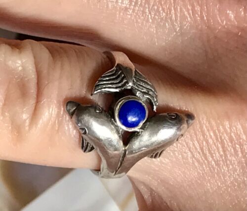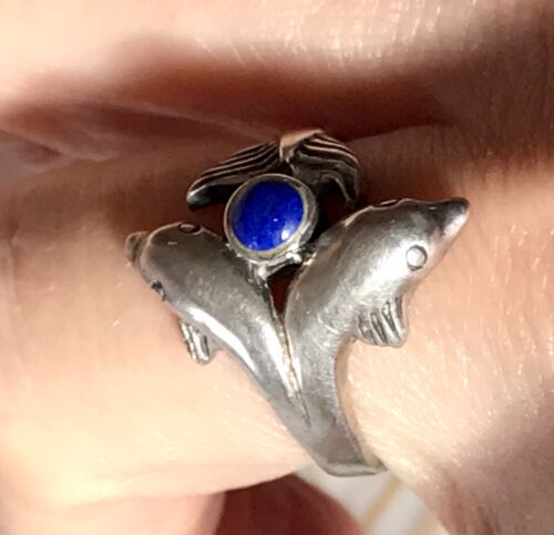 Sehr schönes wundervoll gearbeitetes Design mit schönem Ringkopf in wundervoller Linie: 2 Delphine mit 1 Ball(Lapislazuli -Stein).