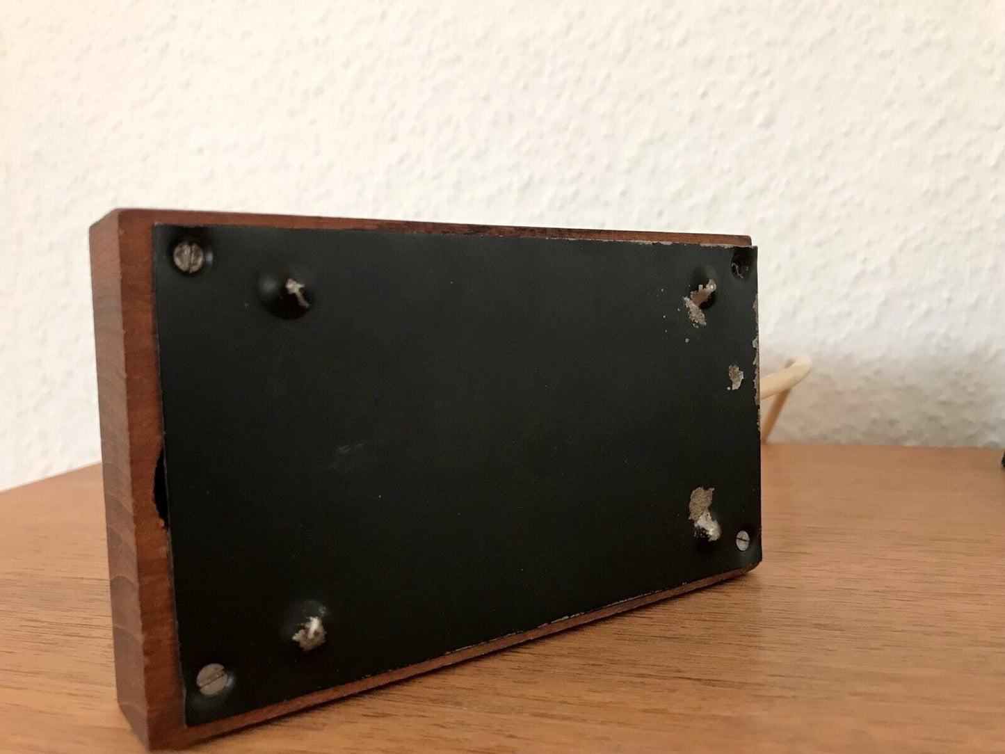 Farbe: Teakholz massiv, dunkelbraun, Metallrückwand, von hinten schwarz, Lampenschirm: Kunststoff weiß.