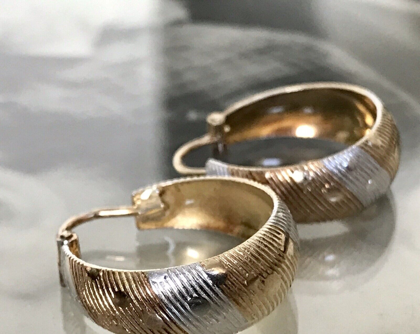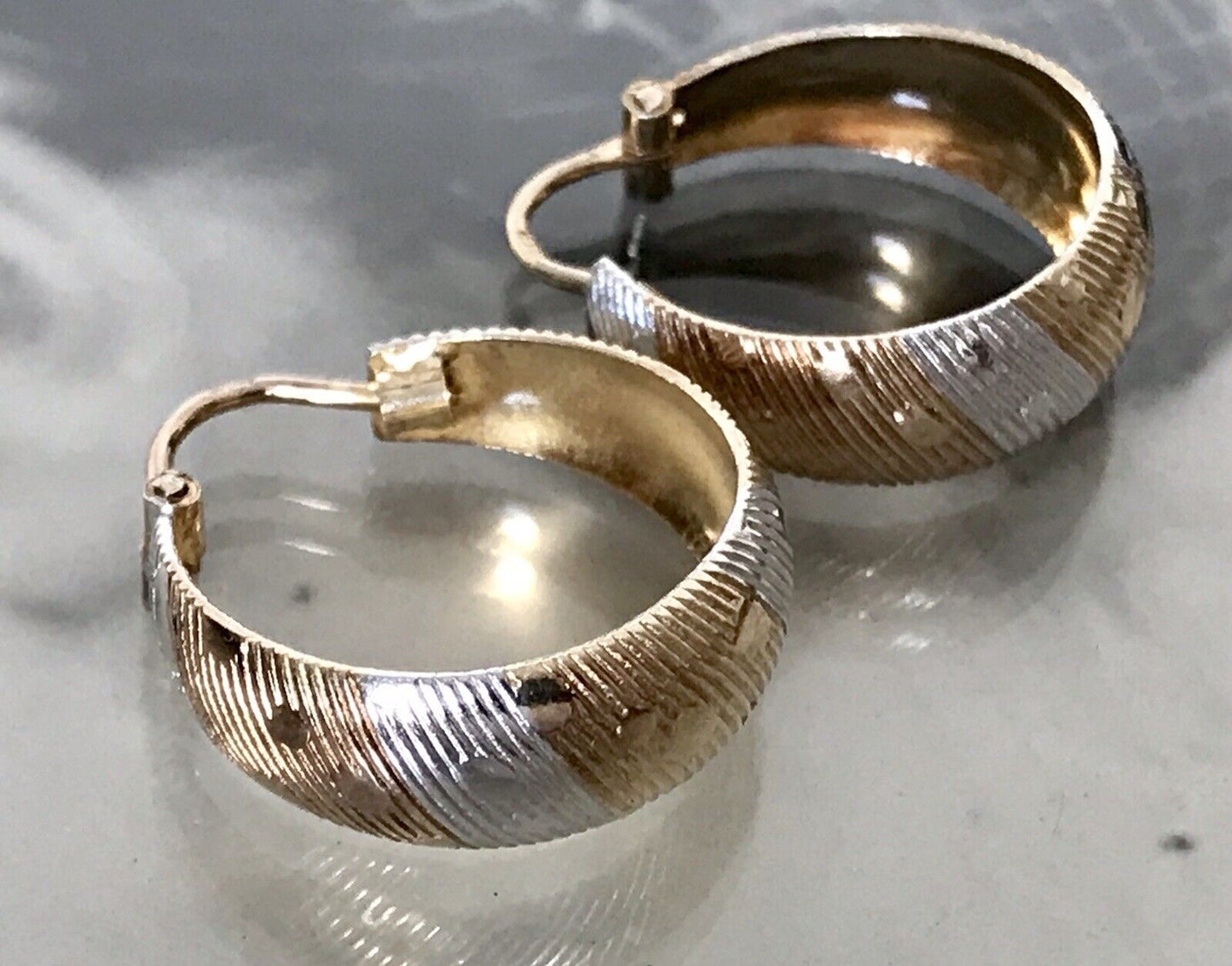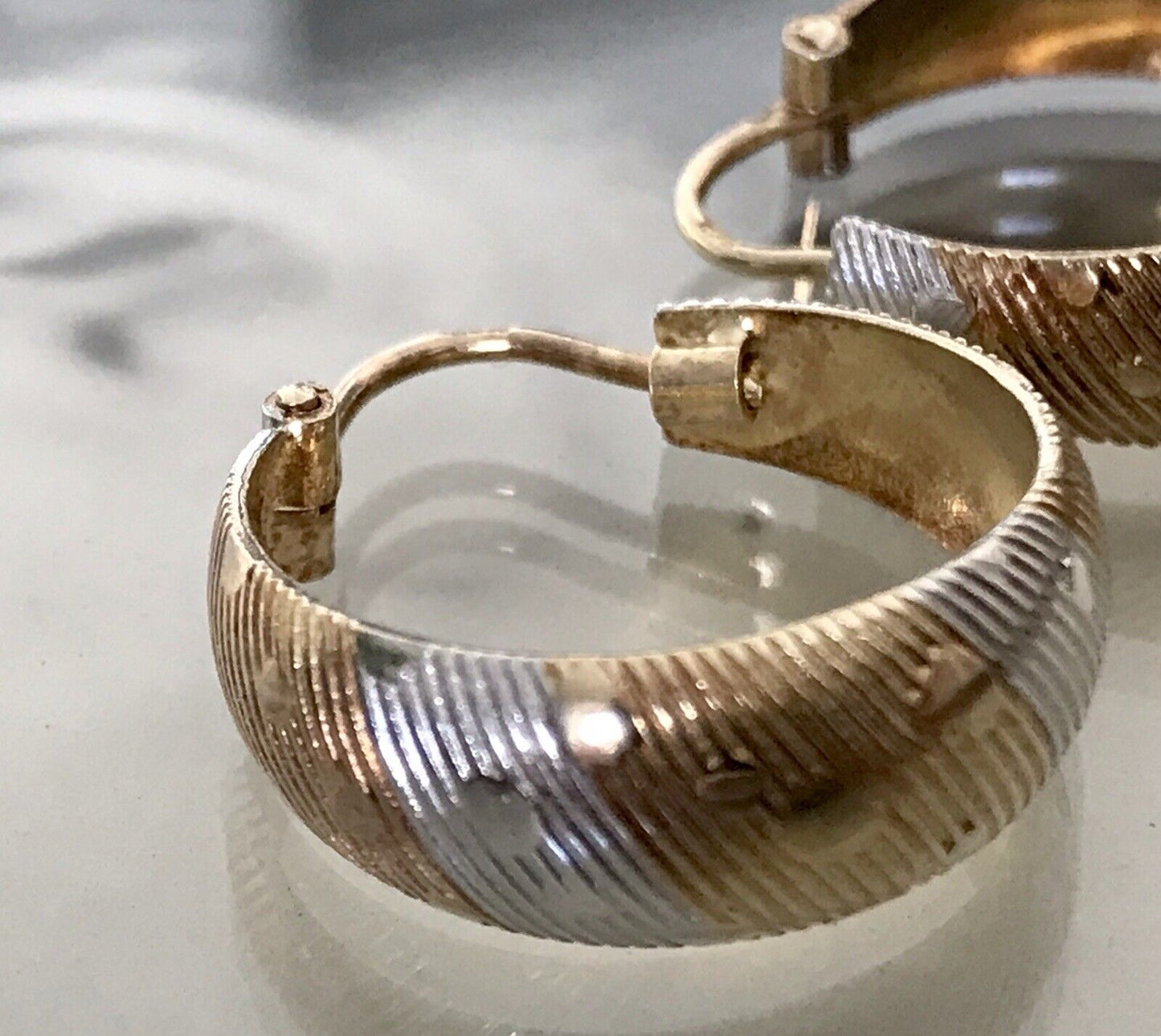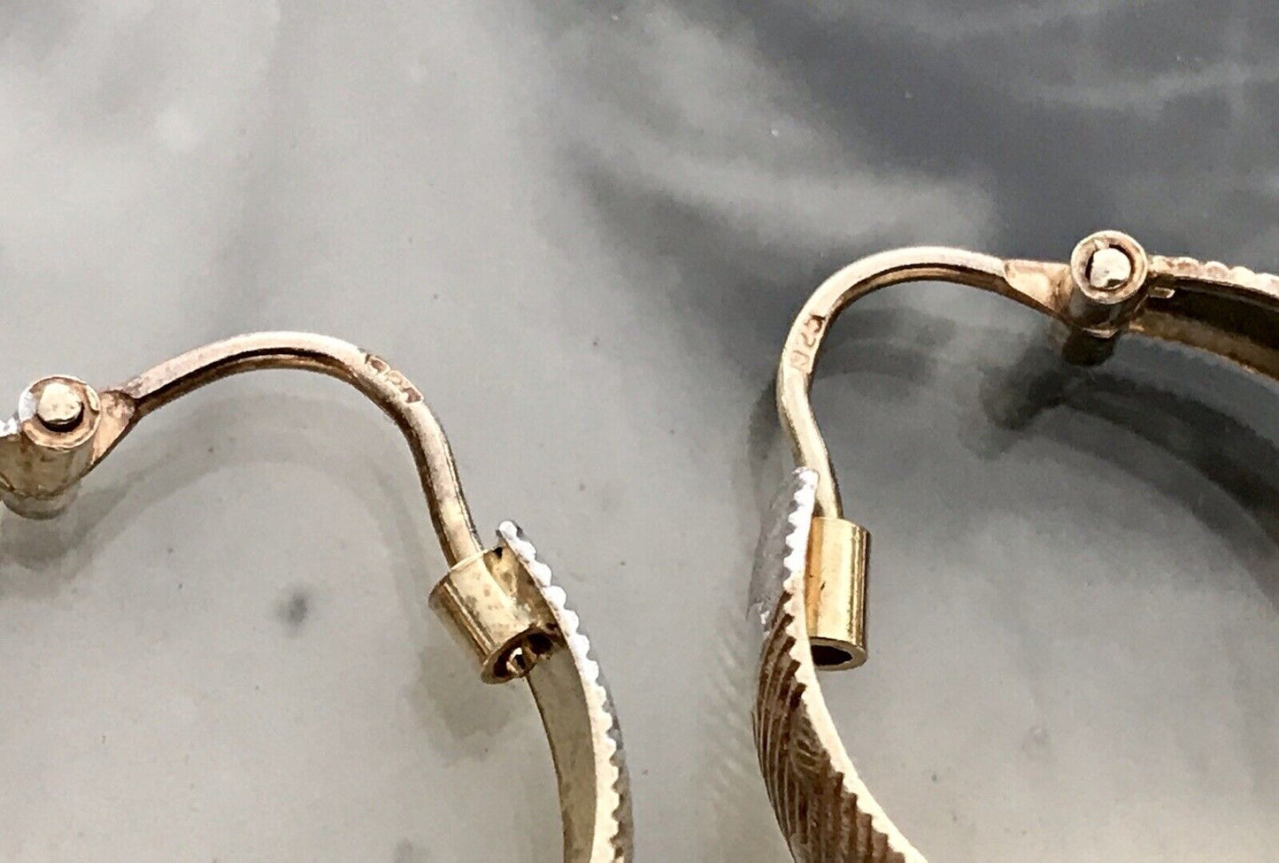 Klassisches elegantes Creolen-Design in edler hochwertigen zweifarbigen Ausführung: außen silber- und gelbgoldfarben mit sich abwechselnden leicht diagonal verlaufenden Passagen, darauf süsse Punkte/Tupfen.