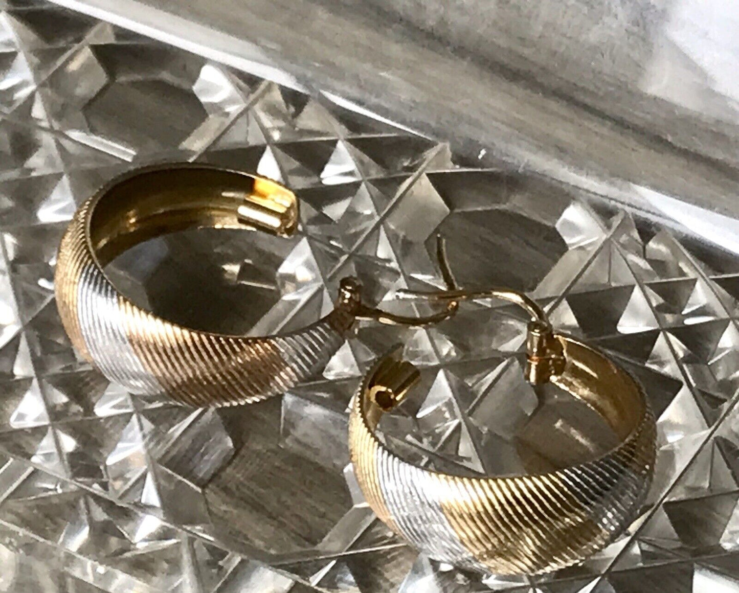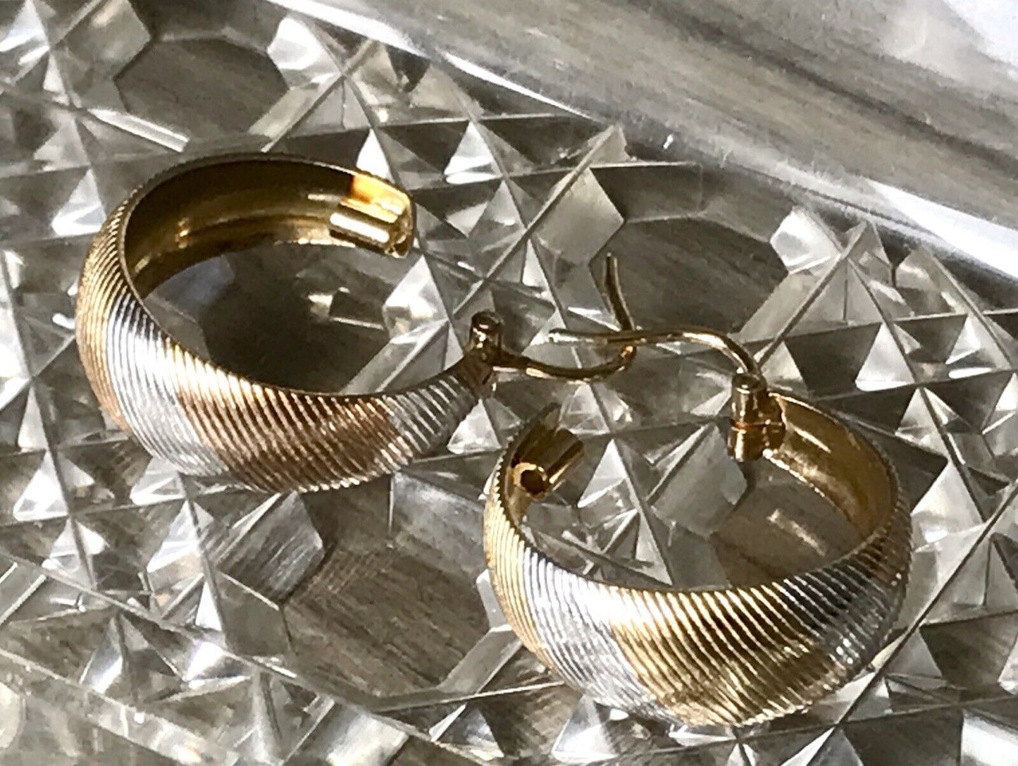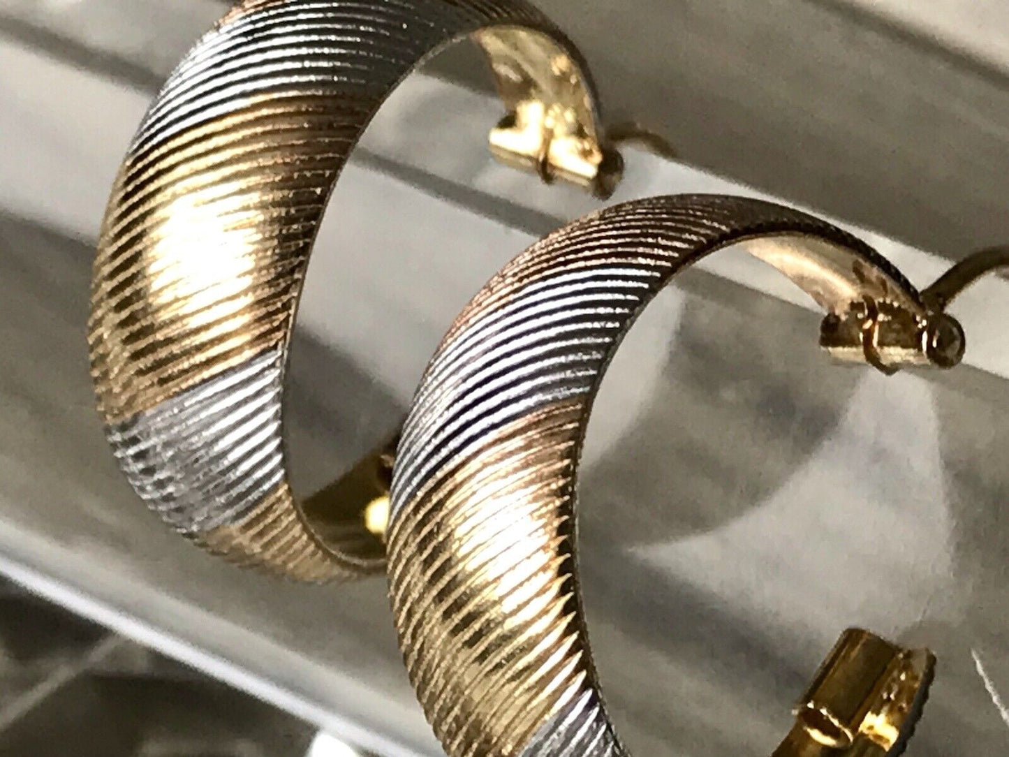 Klassisches elegantes Creolen-Design in edler hochwertigen zweifarbigen Ausführung: außen silber- und gelbgoldfarben mit sich abwechselnden leicht diagonal verlaufenden Passagen.