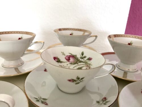 Kommodengriff präsentiert 6 wunderschöne Vintage Gedecke Tassen mit Untertassen mit Rosenmuster