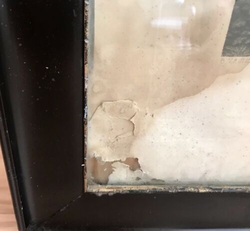 46 cm x 35 cm (Darstellung) / 59,5 cm x 67 cm (Blatt), gerahmt im antiken aus der Zeit stammenden schwarzen Schellack-Rahmen aus Weichholz.