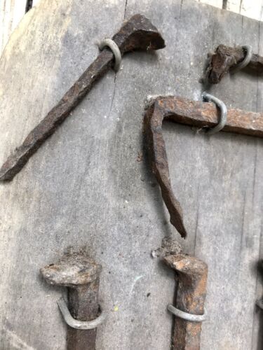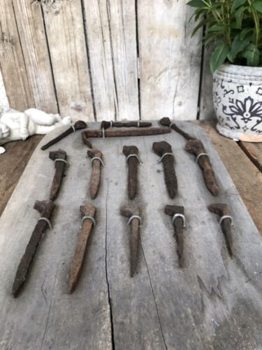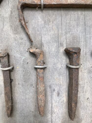 Insgesamt 14 geschmiedete Eisenbahnschienen-Nägel unterschiedlicher Stärke und Länge angeordnet.