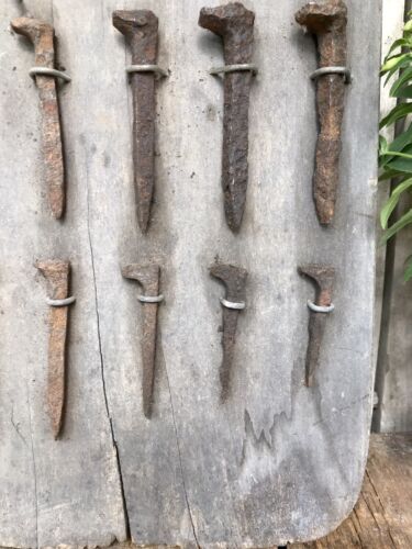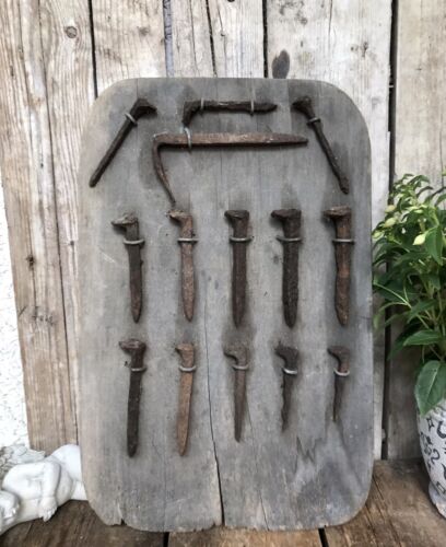 antike Schmiedeeisen-Eisenbahnschienen-Nägel-Sammlung auf einer Holz-keilförmiger Tafel befestigt