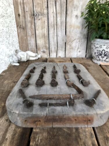 Rarität Antik Sammlung von antiken Eisenbahn Schwellen Gleis-Nägel a. Holztafel