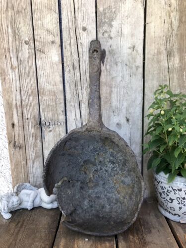 W01-05Kommodengriff präsentiert eine Rarität: einen antiken uralten schmiedeeisernen über 3,500g schweren Kochgefäss Gießtiegel vmtl. zum Zinn-Gießen mit sehr dicker Wandung, rundem Boden und ebenfalls sehr massiven Stiel mit Loch zum Aufhängen.