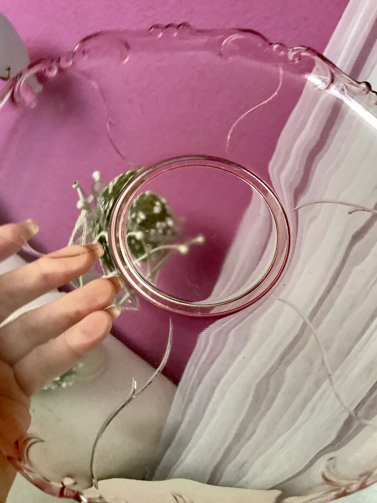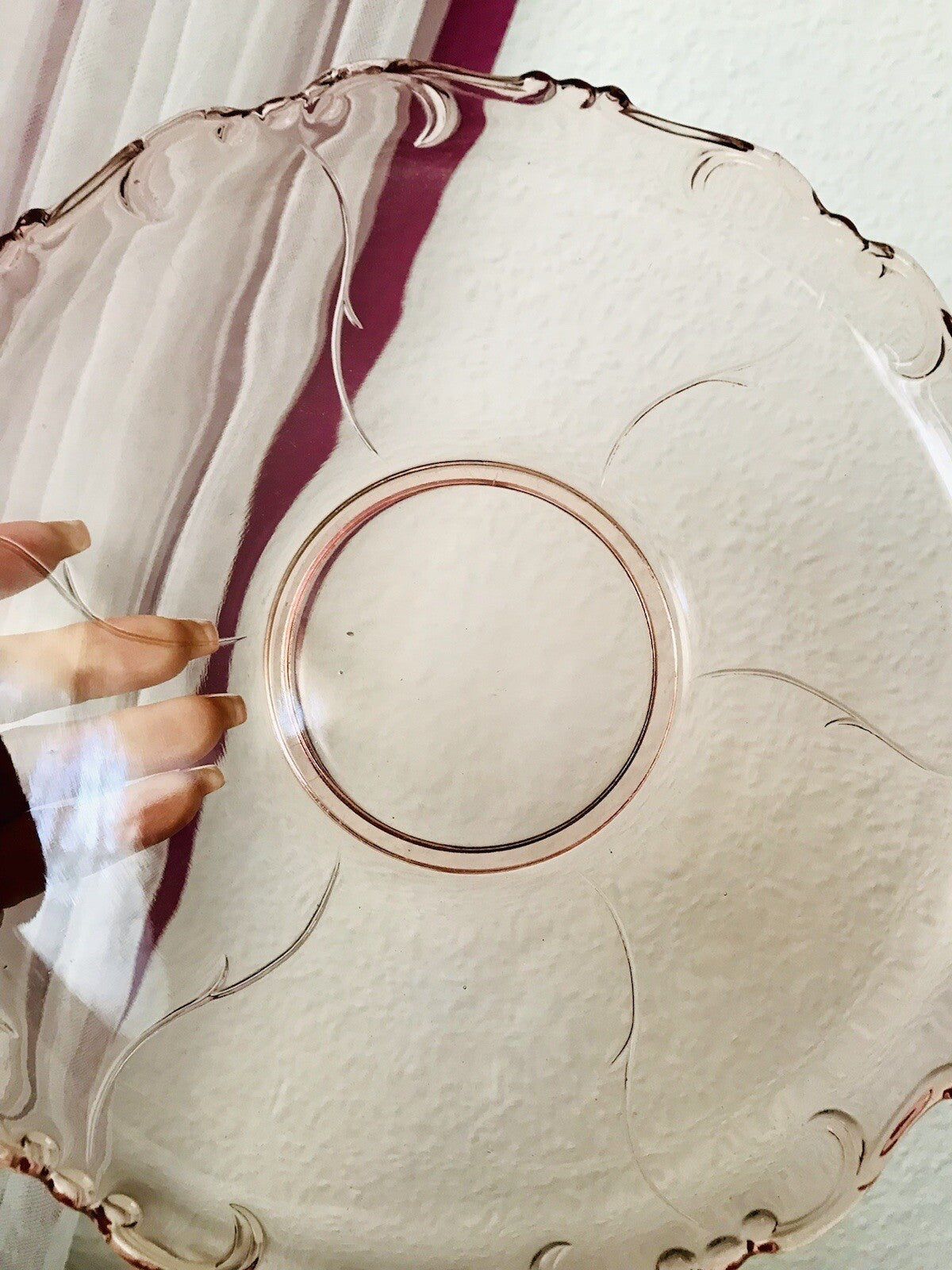 Wunderschön gearbeiteter Kuchenteller Kuchenplatte zauberhafte zum Verlieben schönen flache Schale aus edlem rosafarbenen Rosalin-Glas besticht durch wunderschöne typische runde Art Déco-Form und schönes geschweiftes barock anmutendes Rand-Muster.