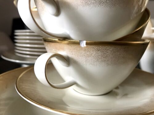 Wunderschönes sehr feines sehr geschmackvolles typisches für 60er Jahre Goldstaub-Dekor als breite Borte mit moderner abstrakter Verlauf-Optik (und in sich abstrakt dezent gemustert) auf den Tellern auf elfenbeinfarbenen Porzellan.