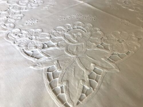 Kommodengriff präsentiert eine wunderschöne alte weiße rechteckige Tischdecke aus Baumwolle mit wundervollem floralen rosettenförmigen Blumen- Muster als mittiges Muster und schönem Saum und Ecken in Durchbruchmuster mit „Bändchenspitze“