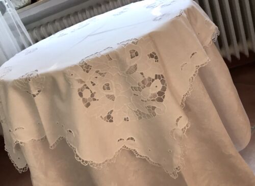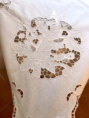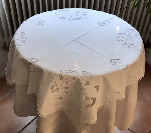 Tischdecke 85 x 84 Stickerei weiß Baumwolle Spitze elegant floral 4 Rosetten
