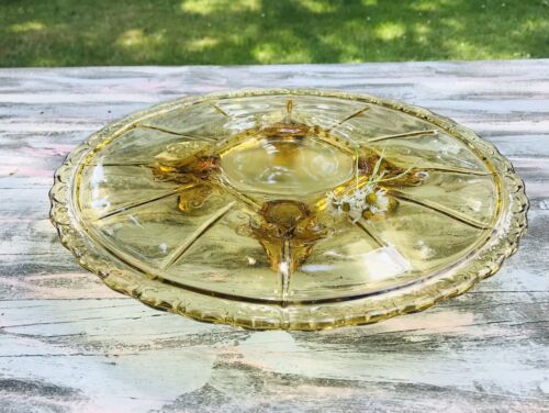 Wunderschön gearbeitete zauberhafte zum Verlieben schöne Tortenplatte aus edel wirkenden Bernstein gelben Glas Pressglas Glas besticht durch wunderschöne typische beliebte in der Zeit barocke Art Déco-Form und reliefierten geschweiftes Muster und gewellten Rand.