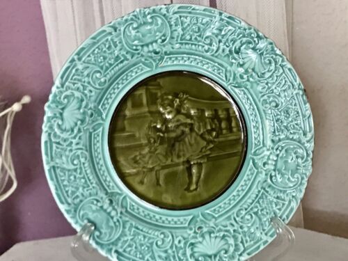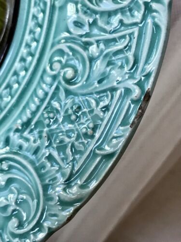 Wunderschöner seltener Zierteller mit wundervoller Farbe türkis mit floral stilisierten dichten reliefierten passig gearbeiteten Motiv der Fahne mit Rocaillen, Akanthusblattwerk, umlaufend reliefiert als dichte wunderschöne Borte für den außergewöhnlichen olivgrünen Spiegel mit beeindruckenden wundervoll fast 3D wirkenden Relief (Motiv mit einem mit Puppe spielenden Mädchen).