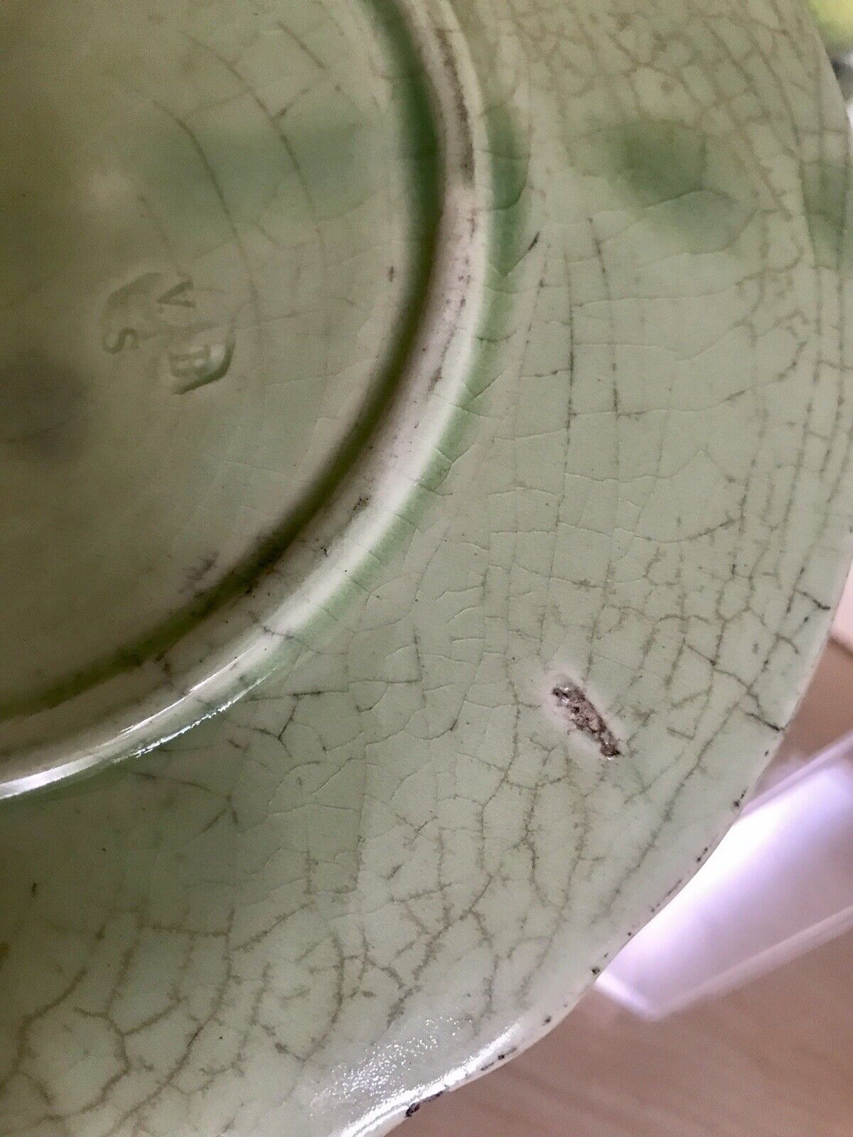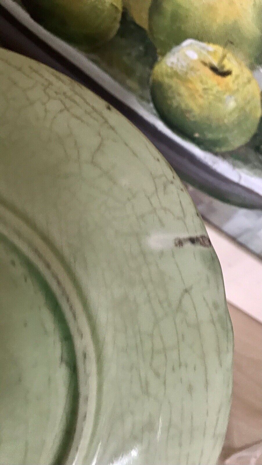 Keine Risse, einpaar winzige oder kleine Macken sowohl produktionsbedingte der Glasur (insbesondere rückseitig starke Craquelée und Unterglasurverfärnungen) und kleine Macken der Glasur vorderseitig an hervorgehobenen Stellen, insbesondere am Rand.