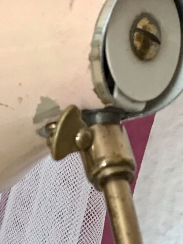 Mit leicht zur Seiten schwenkbaren Messing-Schwanenhals und schön geformten tütenähnlichen in der Höhe und leicht zur Seite verstellbaren Lampenschirm aus lackiertem Metall.