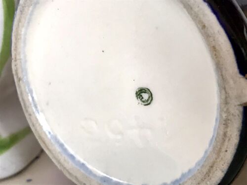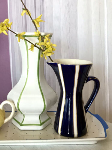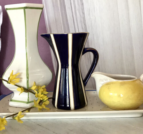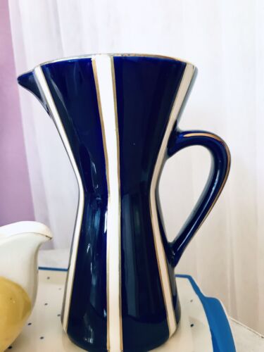 Vintage 50er Keramik Kanne Krug Dekor kobaltblau weiß Goldrand wunderschön!