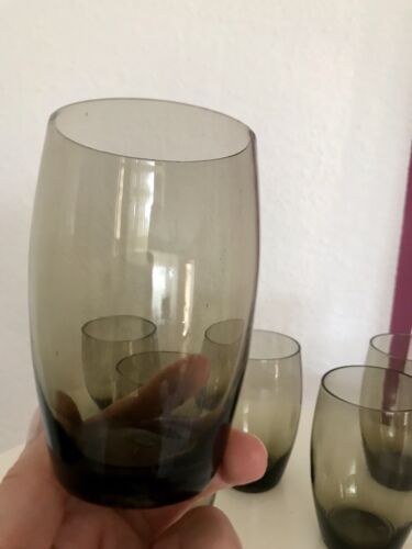 Vintage 60er 6x Wassergläser Gläser Becher Trinkgläser Rauchglas graubraun fassförmig