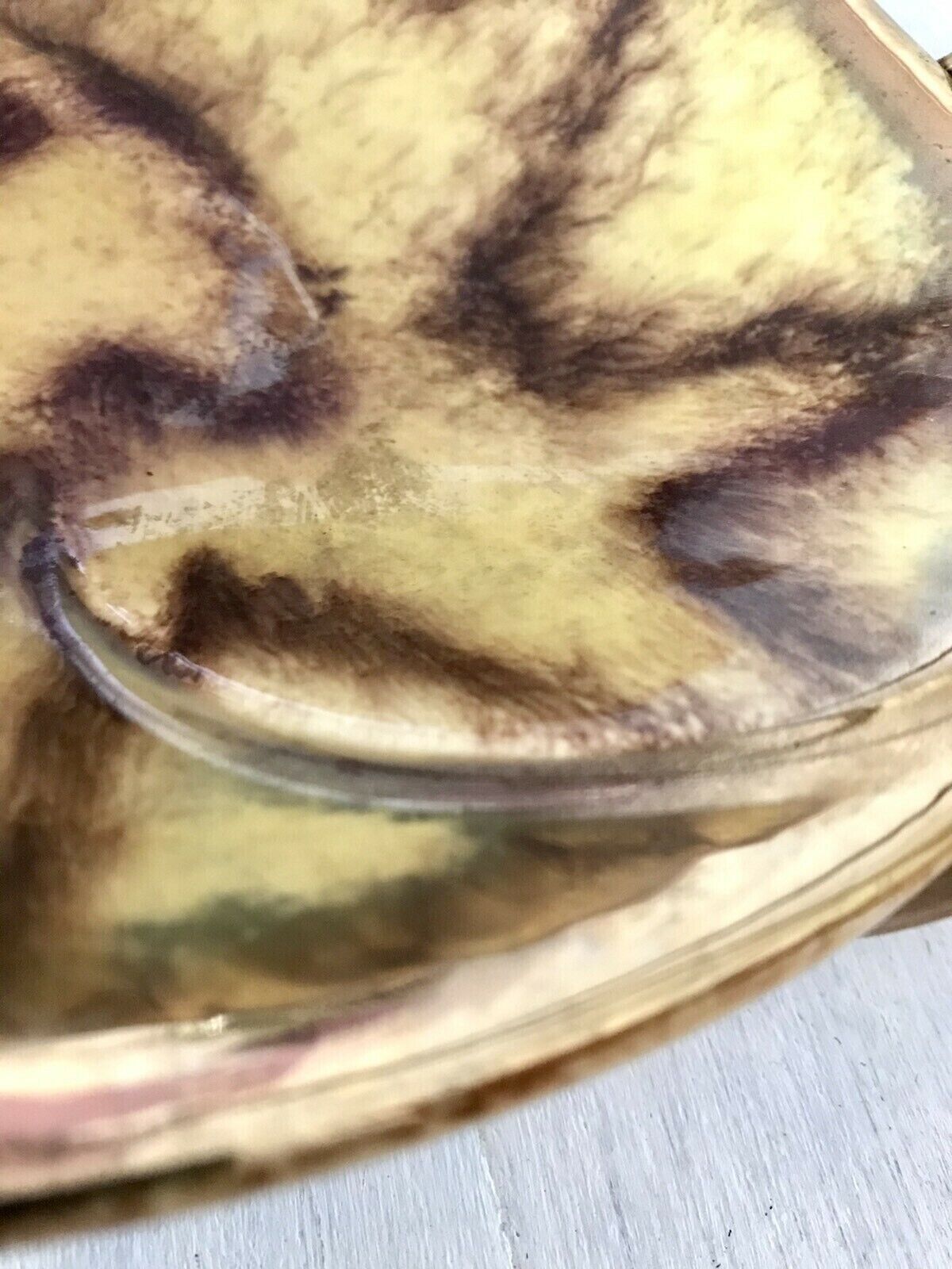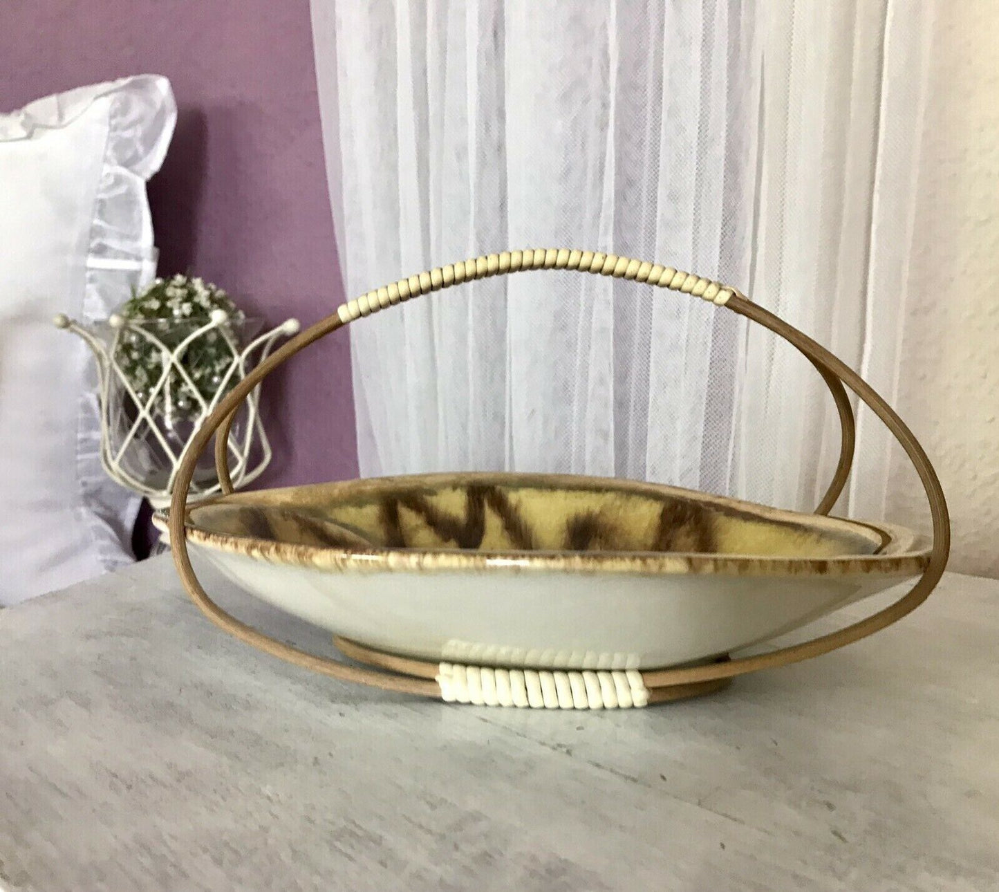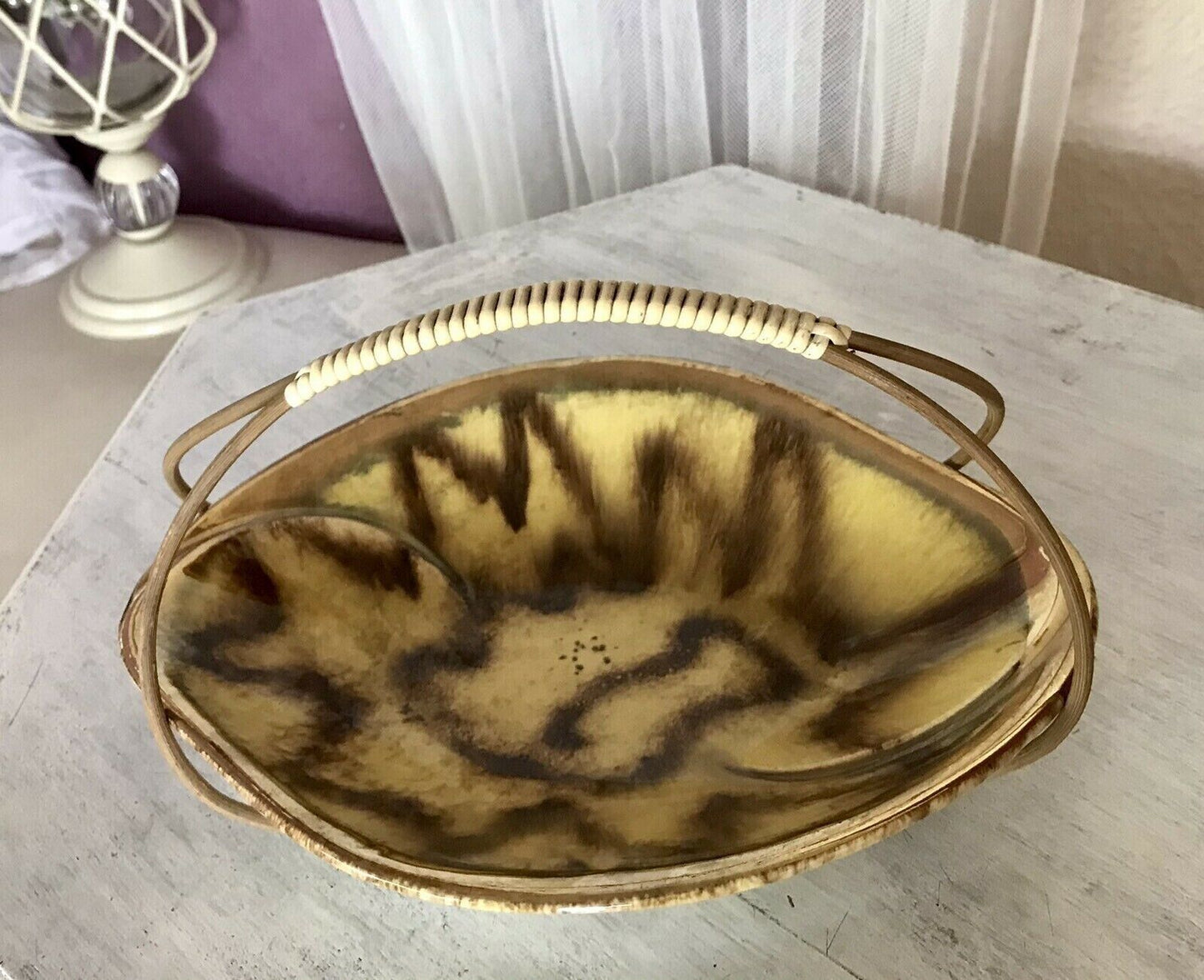 Vintage 60er Keramikschale Rattangestell Schale in Nierenform Laufglasur