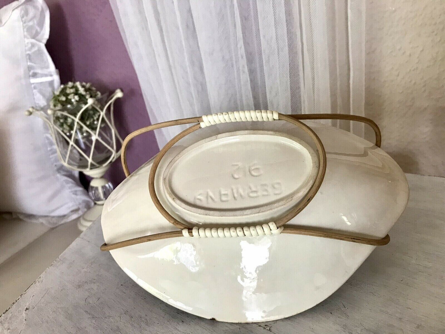 Kommodengriff präsentiert eine schöne Vintage-Keramikschale in Nierenform und in Rattangestell.