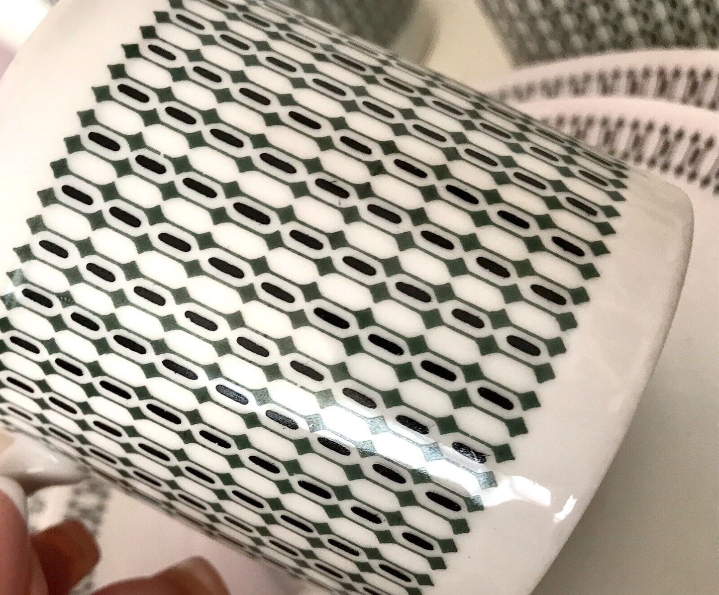 Wunderschönes geschmackvolles rassiges Mitte Jahrhunderts Modernes Porzellan-Service in wunderschöner Farbkombi und schönem aus Entfernung wie kariert wirkendes Design, das nah aus abstrakten schönen Muster-Reihen besteht.