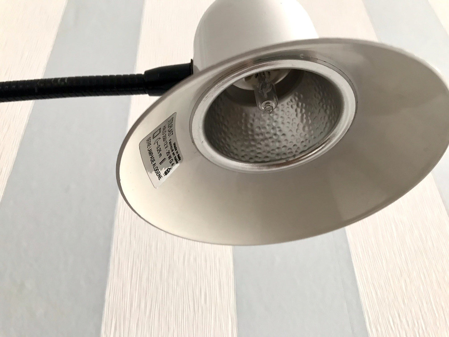 Der schwenkbare mit geripptem Kunstoff? ummantelte schwarze Arm mit dem weißen runden Lampenschirm lässt sich stufenlos in der Höhe und Tiefe verstellen und schwenken.