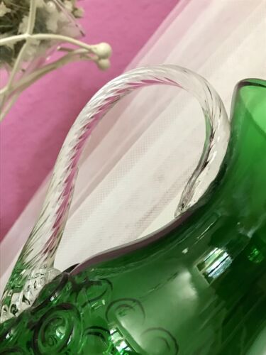 Kommodengriff präsentiert einen wunderschönen edlen großen mundgeblasenen Vintage Krug Kanne Glaskaraffe Karaffe Henkelkrug aus schönem grünen Glas in wunderschönem Farbton