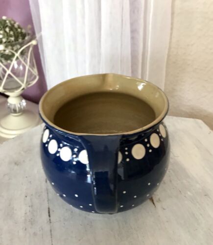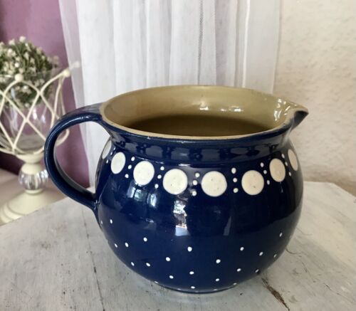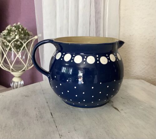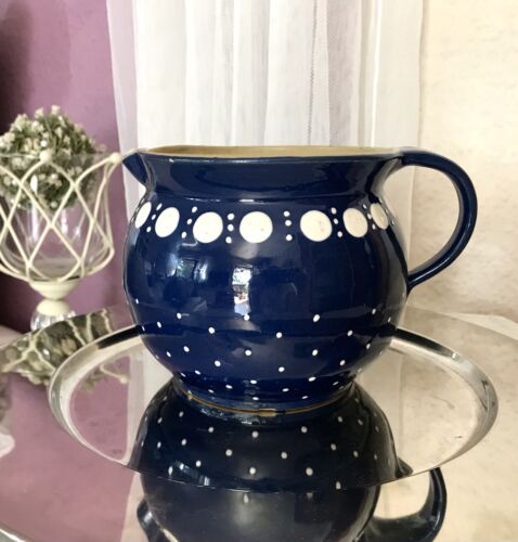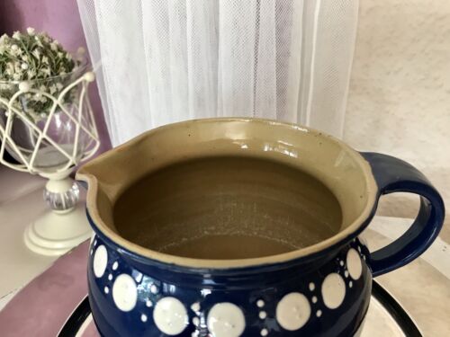 Kommodengriff präsentiert eine entzückende wunderschöne alte Vintage Kanne Milch-Kanne Saftkanne Krug aus außen blau Weiß glasierter Keramik, Innenseite beige