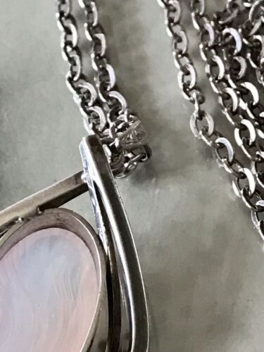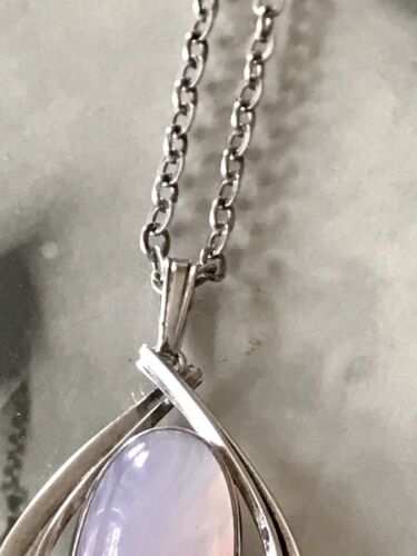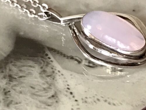 Der Anhänger ist ist modernem Design gearbeitet und ist besetzt mit rosa Stein, vermutlich Rosenquarz.