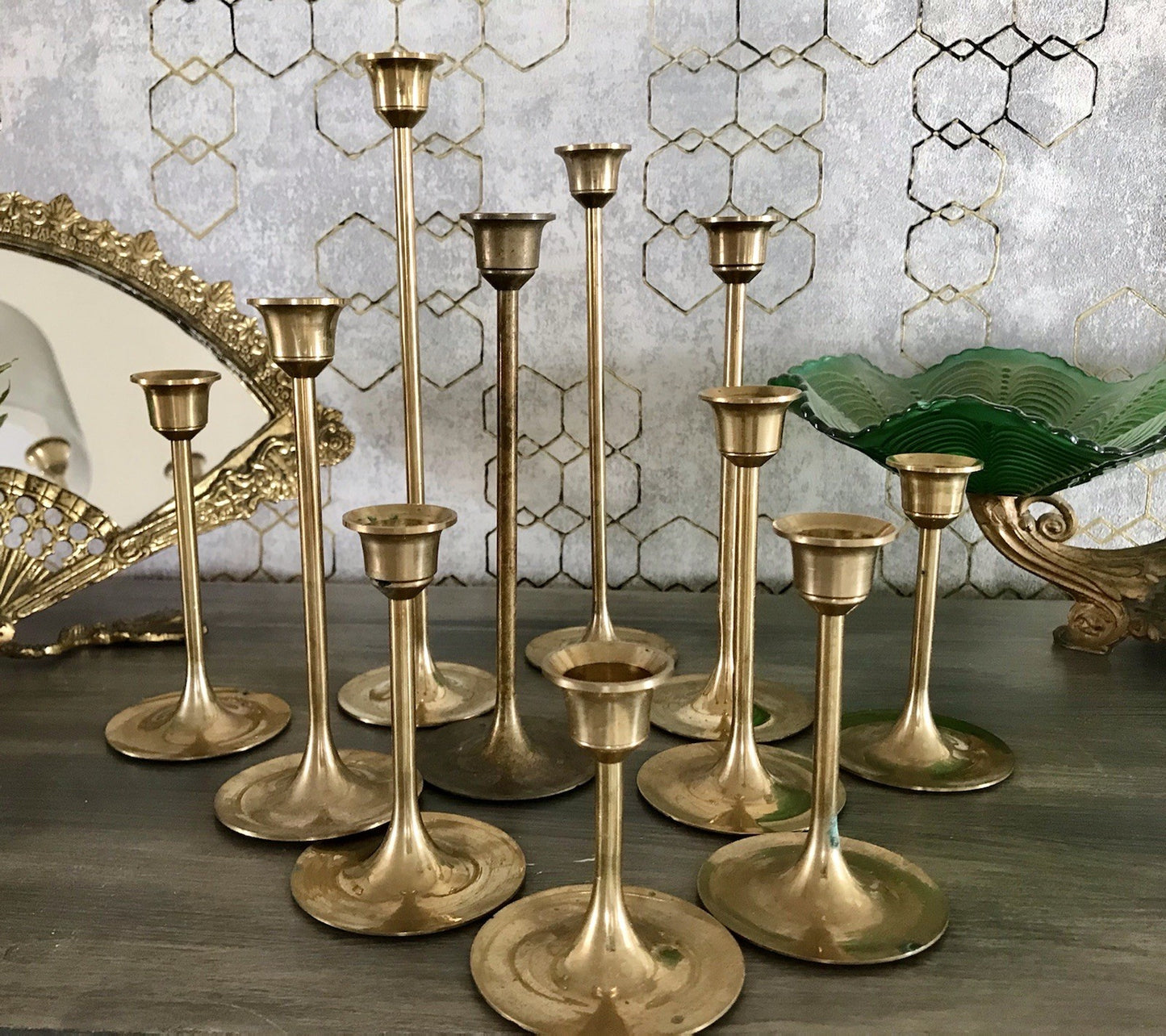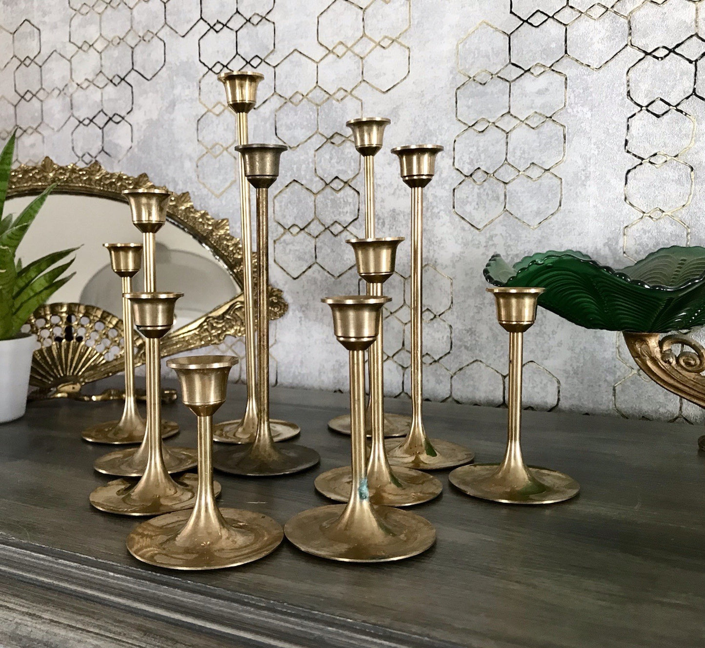 Kommodengriff präsentiert 11 wundervolle alte „tulpenförmige“ Vintage Kerzenständer Kerzenhalter Kerzenleuchter aus Messing aus den 70er Jahren