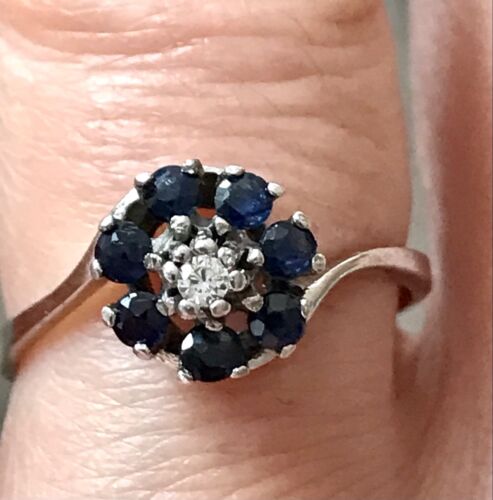 Typischer Entourage-Ring mit einem zentralen wunderschön geschliffenen farblosen hochgefassten edel wirkenden Stein (vielleicht sogar einen der edelsten Sorte?, aber nicht getestet) und rundum angeordneten blauen ebenfalls in Krappen gefassten Steinen vermutlich Saphiren (aber auch hier nur „vermutlich“, denn nicht getestet).