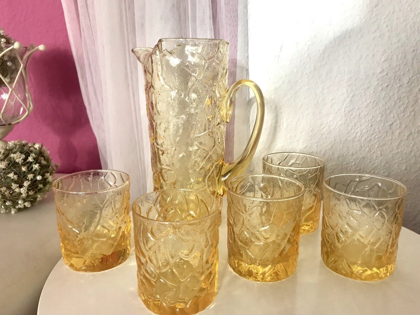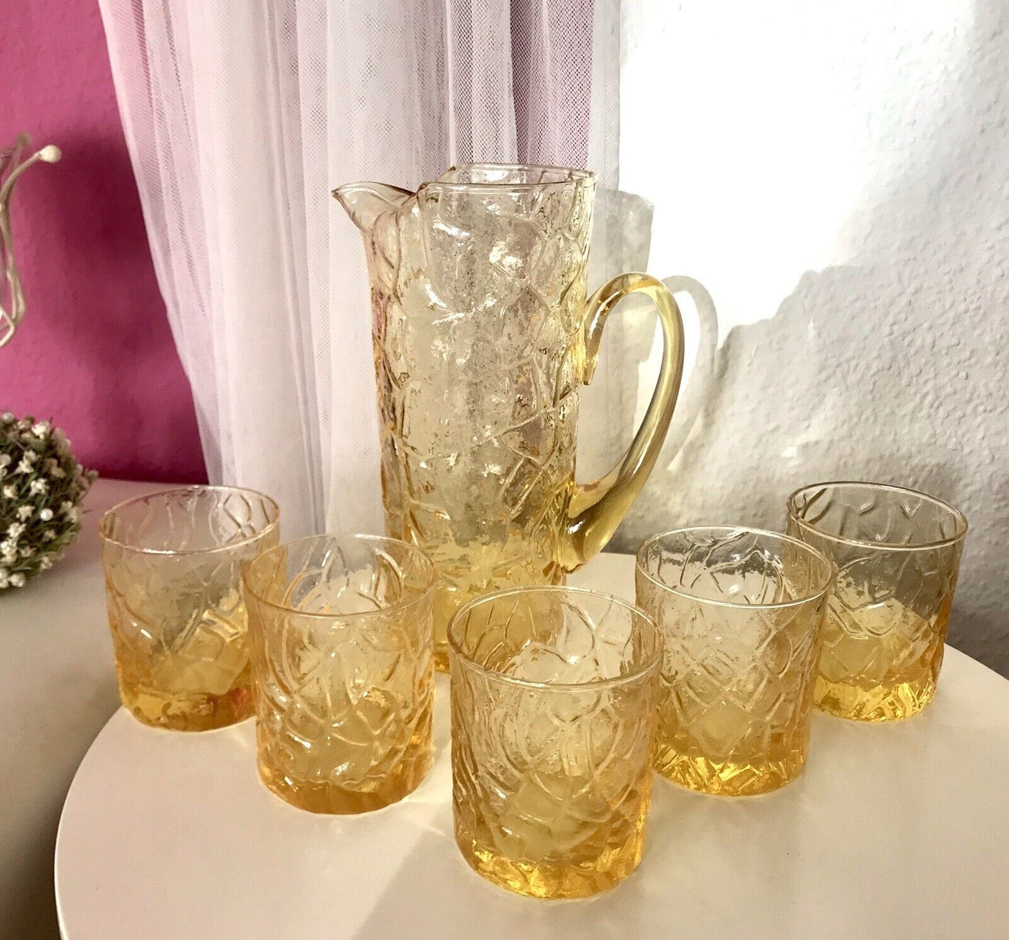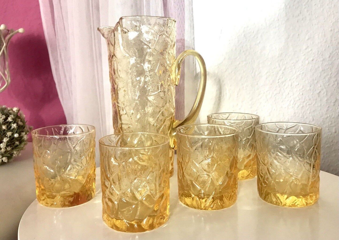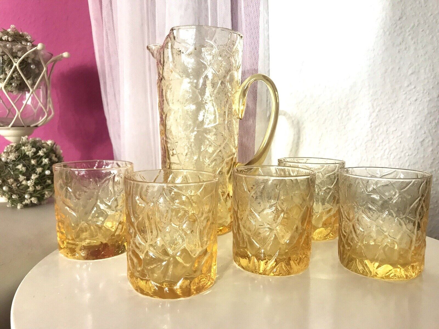Kommodengriff präsentiert ein wunderschönes Vintage Designer Glas- Set bestehend aus 1 Krug Glaskaraffe Karaffe Henkelkrug und 5 passenden Gläsern Bechern für Wasser oder Saft in Farbe gelb