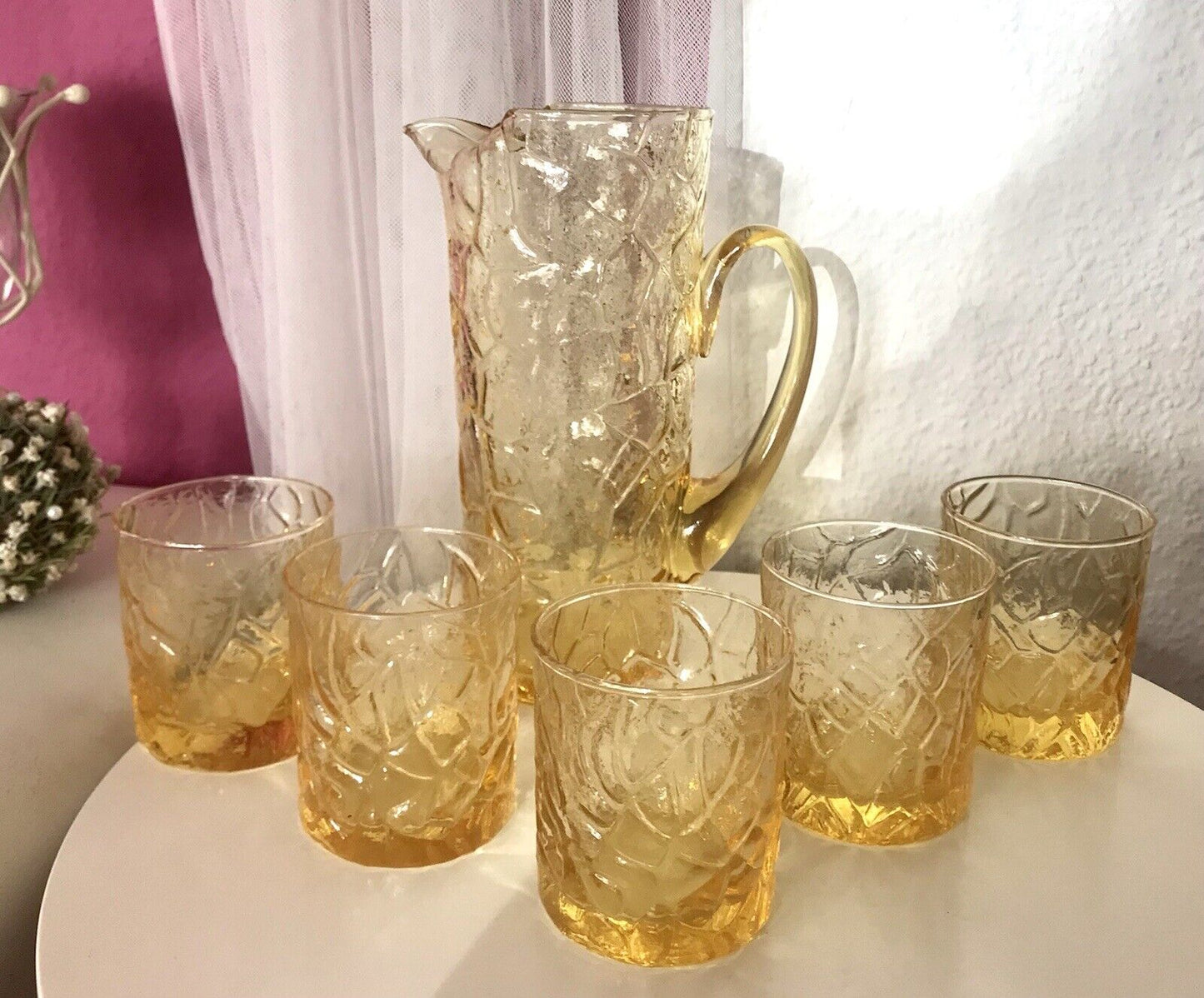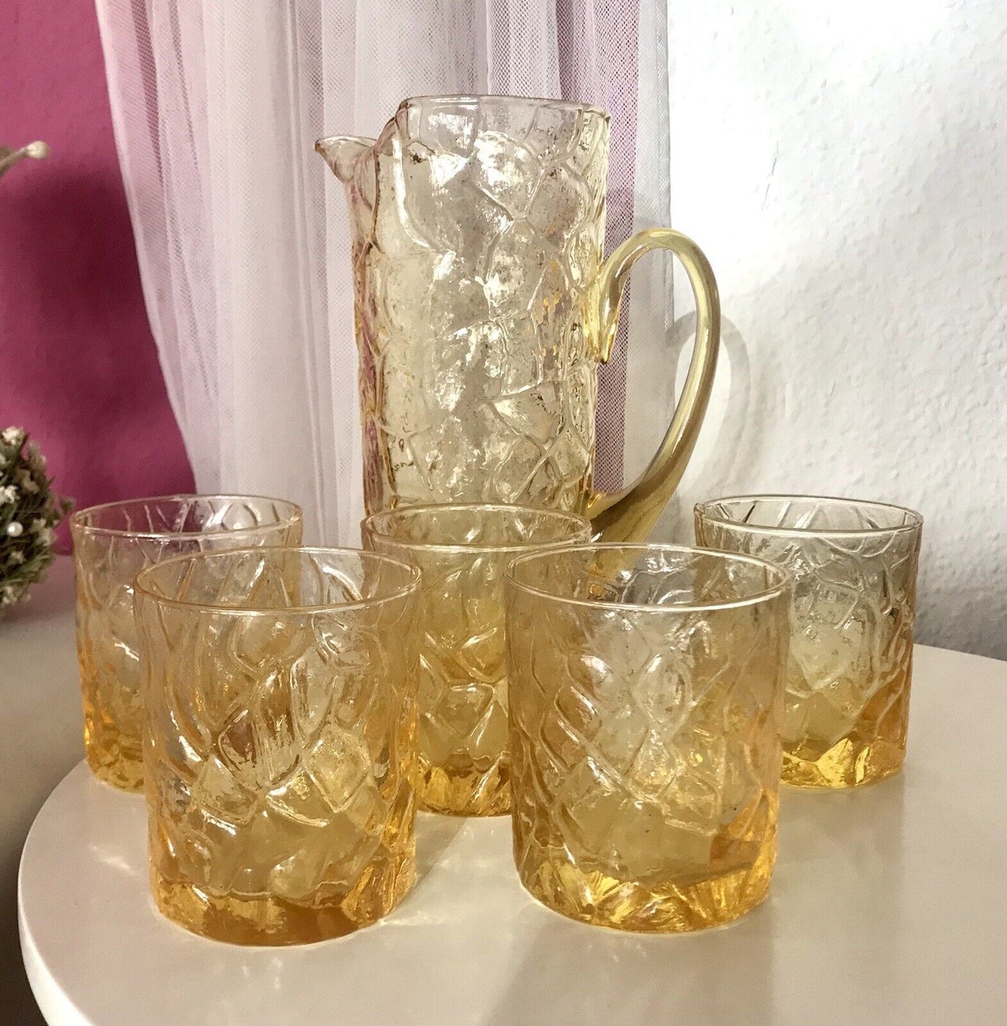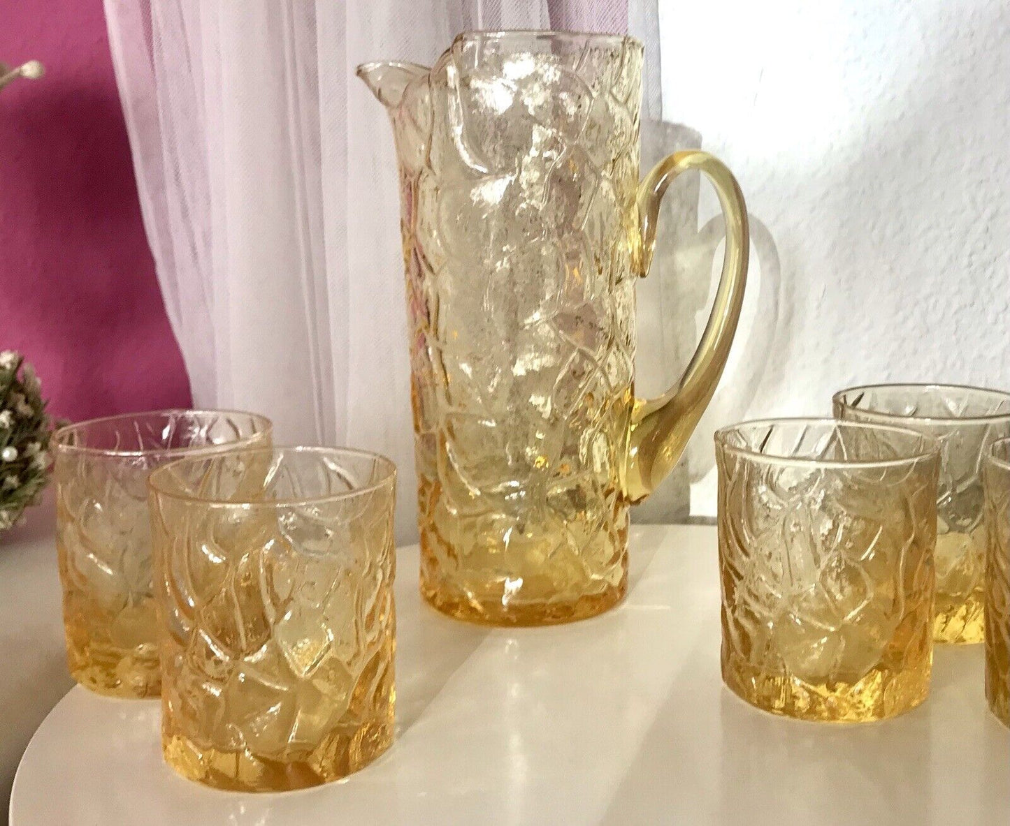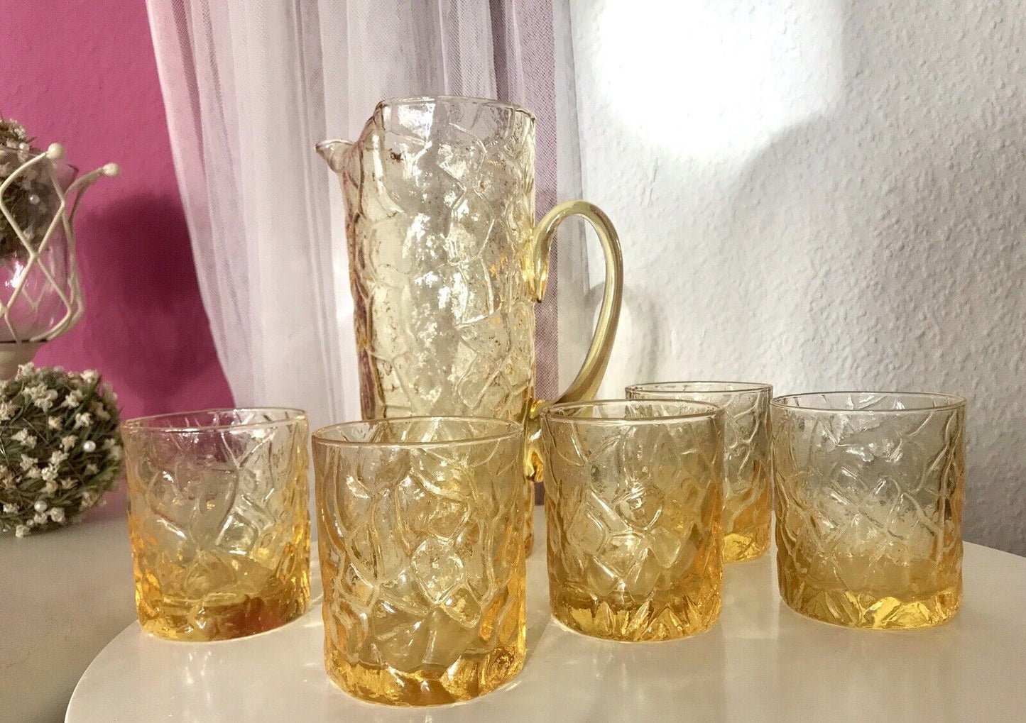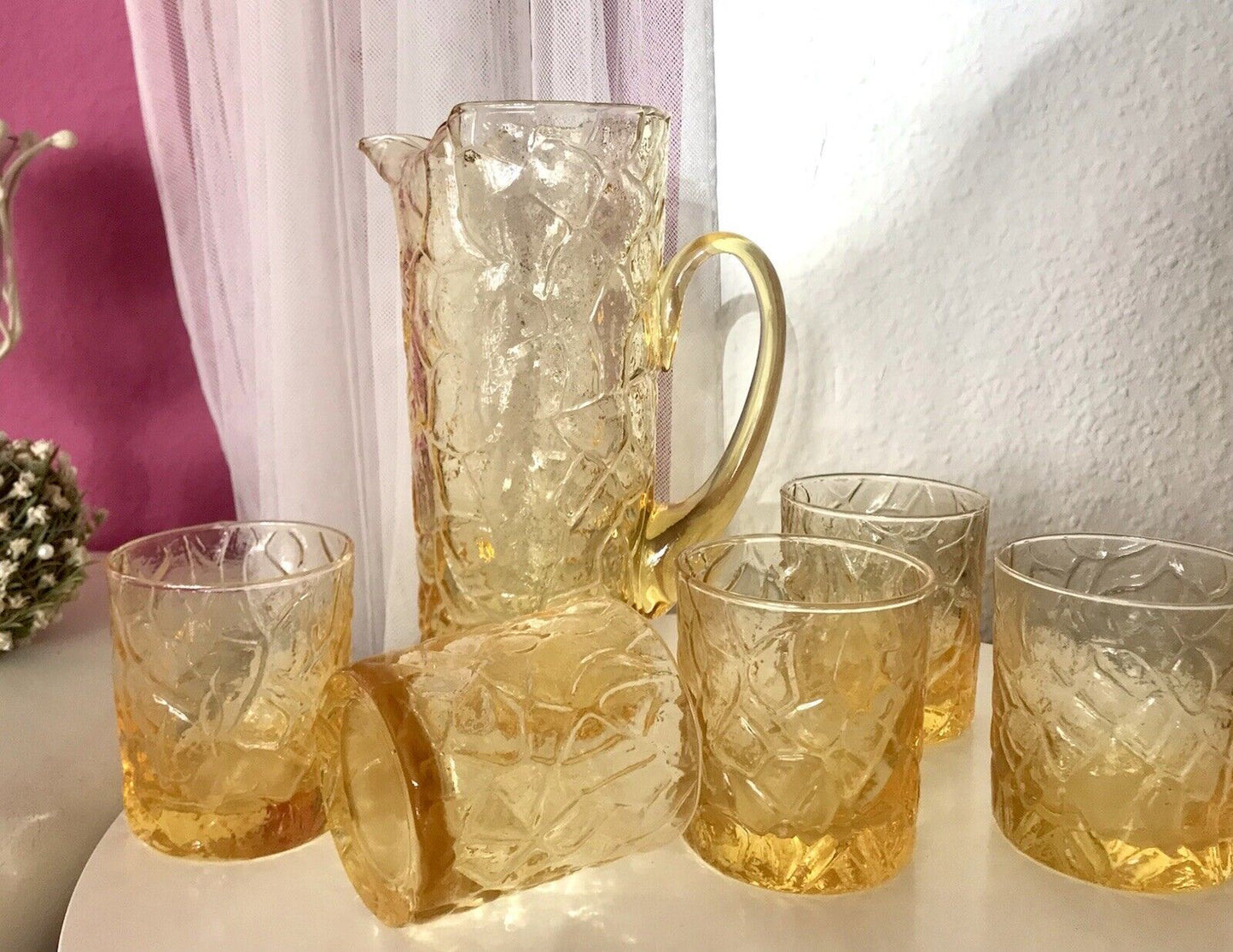 Vintage Designer 60er 70er Krug Kanne Karaffe 5 Becher gelb Glas Reptil Struktur